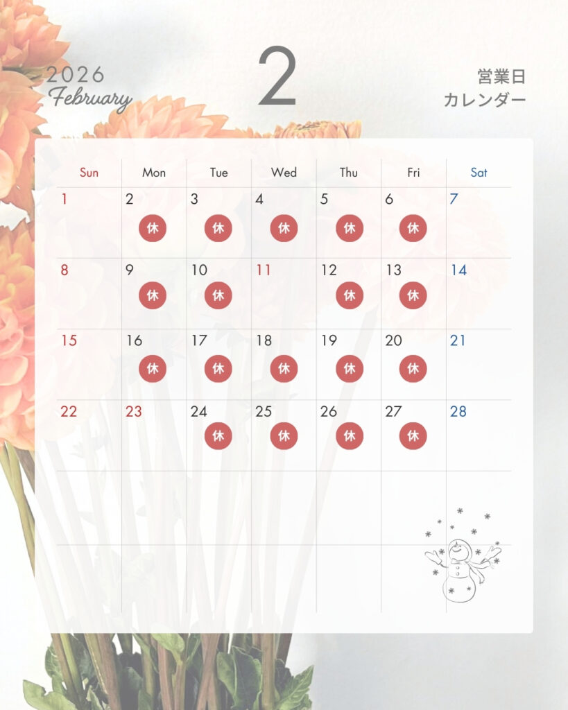 2月も冬季営業期間につき、土日祝日のみの営業となります。